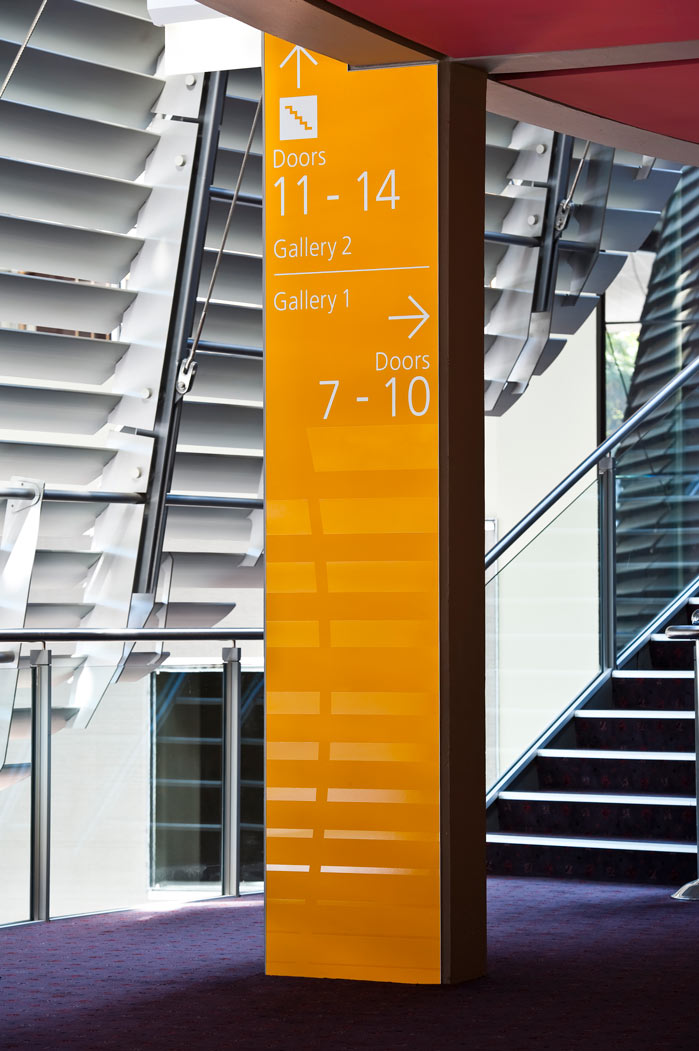 Within the foyer – a stunning space dominated by an imposing and brightly lit veil of louvered aluminium – colour is kept to a minimum and signage remains unobtrusive while clearly and effectively guiding theatregoers from building entry to theatre door.